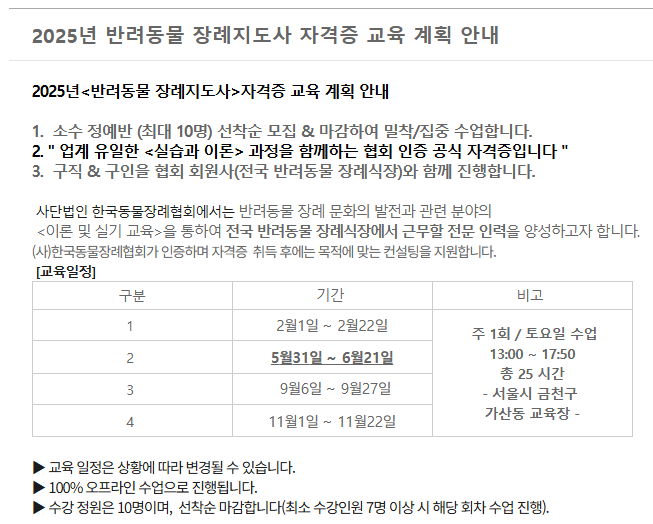 커리큘럼은 반려동물 장례의 정의와 직무, 관련 법률, 장례 실무 등으로 구성되어 있으며, 온라인 시험을 통해 자격증을 취득할 수 있습니다.