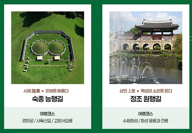 사릉은 인목대비의 왕릉으로 울창한 소나무길이 인상적이며, 융건릉은 정조가 아버지 사도세자를 위해 조성한 왕릉으로 감동적인 효심의 상징이죠.