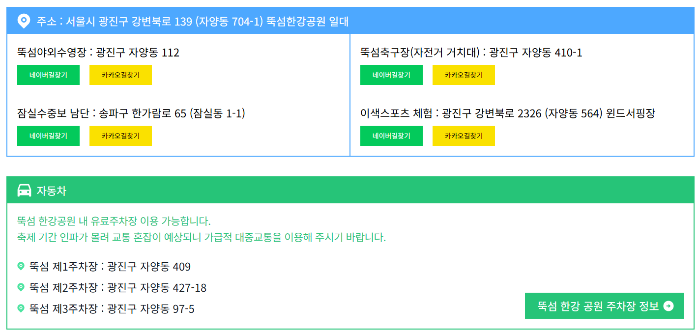 휴대폰 내비게이션 앱에서 "뚝섬한강공원 축제장"으로 검색하면 실시간 경로 안내도 받을 수 있으니 꼭 활용해보세요.