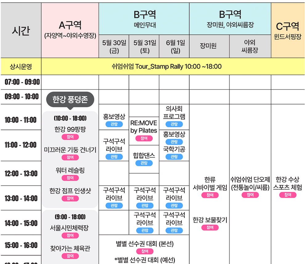 쉬엄쉬엄 한강 3종 축제는 2025년 5월 30일부터 6월 1일까지, 총 3일간 진행됩니다. 매일 오전 9시부터 밤 9시까지 다양한 프로그램이 이어져 하루 종일 머물러도 지루할 틈이 없죠.