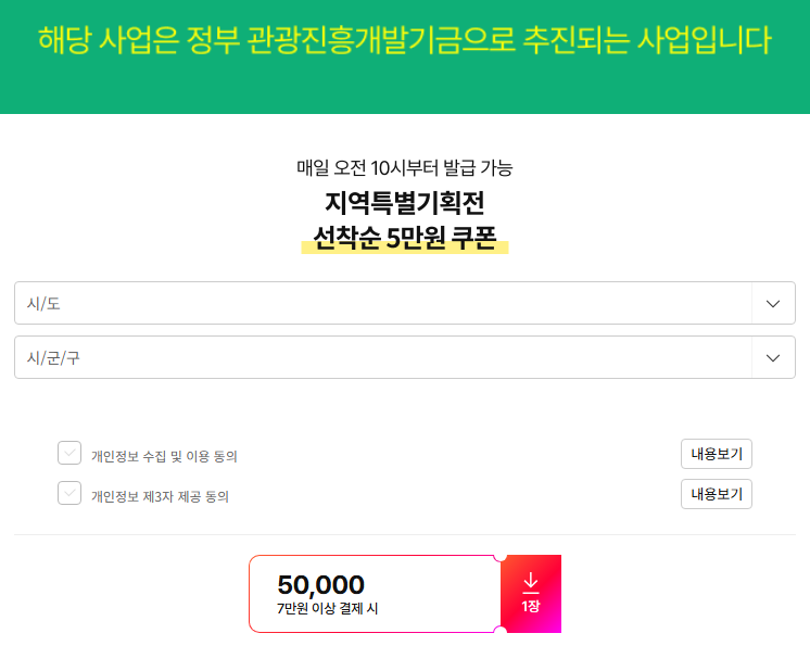 야놀자, 여기어때, 하나투어 같은 주요 온라인 여행사에서 제공하며, 7만 원 이상 숙박 시 최대 5만 원까지 할인되는 구조입니다.