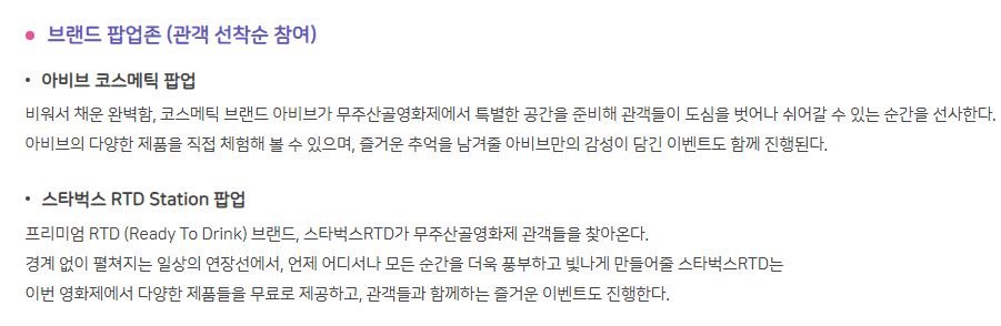 무주읍 시내 곳곳에 설치된 팝업 전시, 음악 공연, 로컬푸드 마켓도 함께 즐길 수 있어요. 이런 부대행사를 알차게 체험하면 하루가 훌쩍 지나간답니다.