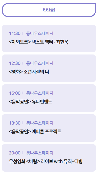 실내 상영 프로그램 예매는 5월 13일부터, 1일 입장권과 숙박·교통 패키지는 5월 14일부터 각각 오픈됐답니다. 상영작 예매는 좌석이 빠르게 마감되니 서둘러야 해요.