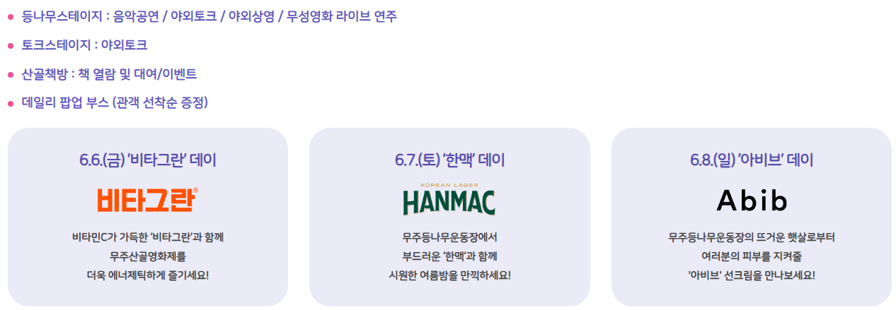 또한 예매 페이지 외에도 지역 내 숙박, 셔틀버스 시간표, 공연 행사 정보까지 자세하게 나와 있어서 초행자도 쉽게 참여할 수 있어요.