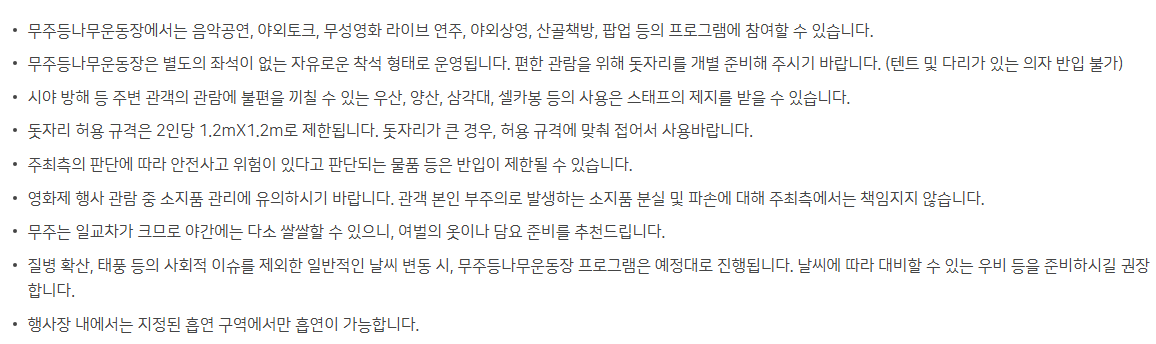 저녁 상영 때는 벌레도 꽤 있으니 벌레 퇴치제나 모기 스프레이도 챙겨두는 것이 좋아요. 그리고 전기 콘센트가 부족하니 보조배터리는 필수랍니다!