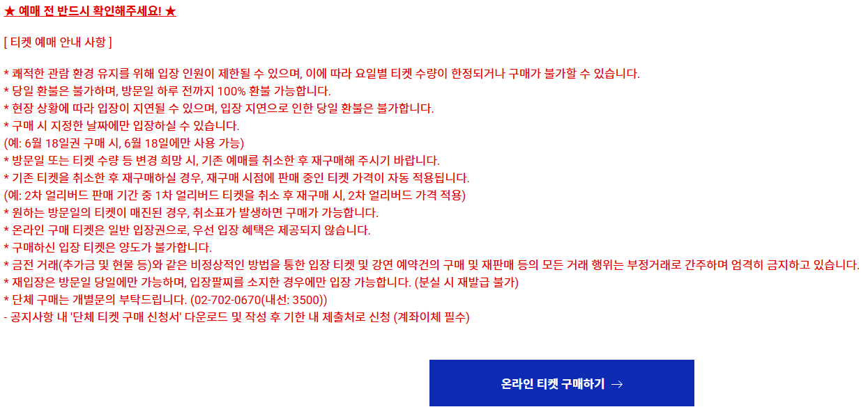 예매를 통해 현장 대기 시간을 줄일 수 있을 뿐 아니라, 할인 혜택도 누릴 수 있답니다.