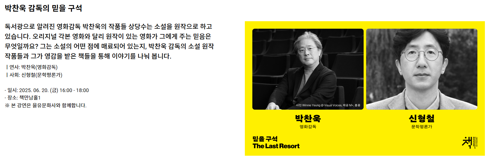 2025 서울 국제 도서전에서는 '믿을 구석(The Last Resort)'이라는 주제로 국내외 저자들과의 특별한 만남이 예정돼 있어요.