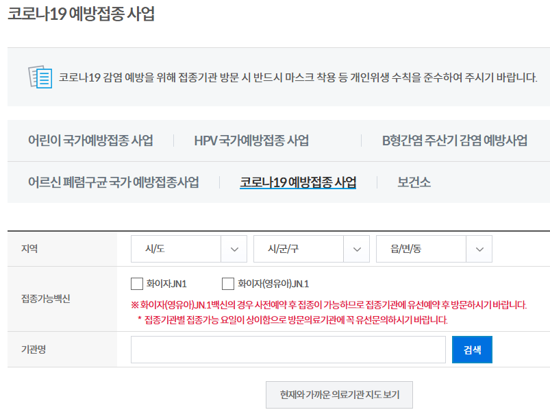 사이트에서는 '코로나19 백신' 항목을 선택한 후, 거주지 인근 병원 중 접종 가능 여부를 확인할 수 있어요.