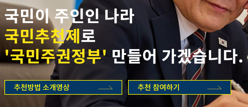 국민추천제는 말 그대로 국민이 장관, 차관, 공공기관장 등의 고위 공직자 후보를 직접 추천할 수 있는 제도예요.