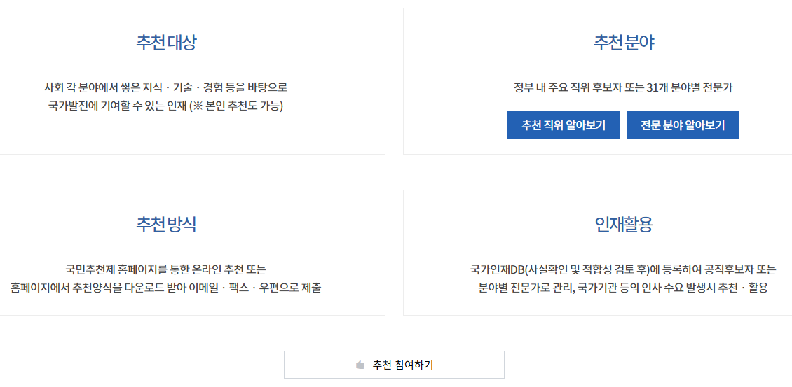 추천 가능한 대상은 장관·차관 등 대통령이 임명할 수 있는 고위공직자 및 공공기관장이에요. 추천자는 누구든지 가능하며, 국민이면 참여 자격이 제한되지 않아요.