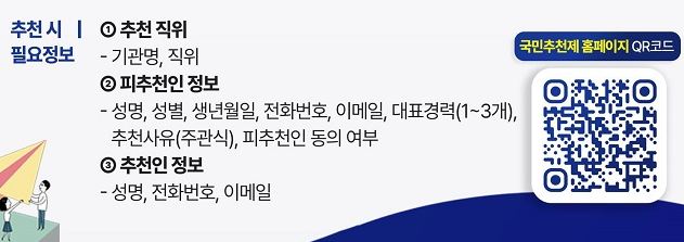네, 맞습니다. 국민이면 누구나 추천인으로 참여할 수 있으며, 나이, 직업, 거주지 등의 제한은 없어요. 단, 추천하는 인물에 대한 정보는 정확히 기재해야 해요.