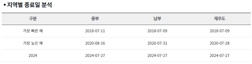 예를 들어 제주도는 다른 지역보다 일찍 시작하고, 종료도 빠른 편입니다. 반면, 중부 지역은 늦게 시작해서 길게 이어지는 경우가 많아요.