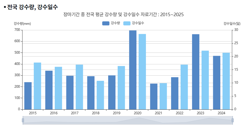 2025년의 경우 장마전선이 북상과 남하를 반복하면서 간헐적인 폭우와 함께 국지성 호우가 잦을 것으로 예상됩니다.