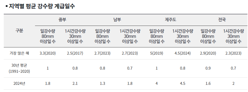 남부 지역은 집중호우와 단시간 폭우에 특히 취약하니 빗물받이나 배수구 정비가 중요해요.