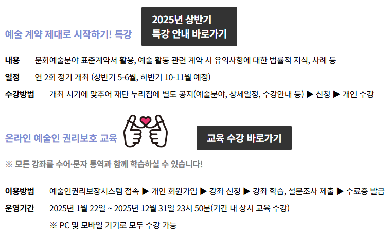 수강은 한국예술인 복지재단 홈페이지 내 ‘온라인교육 누리집’ 메뉴에서 가능합니다.