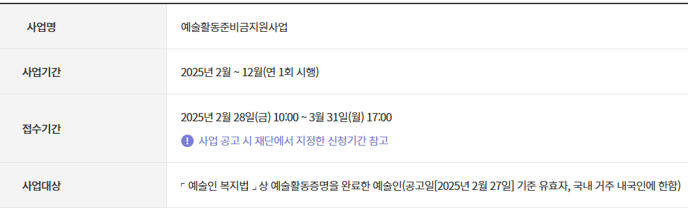 예술활동준비금은 2~3월, 생활안정자금 융자는 4~5월, 산재보장은 연중 신청이 가능하지만 예산소진 시 마감되기도 하죠.
