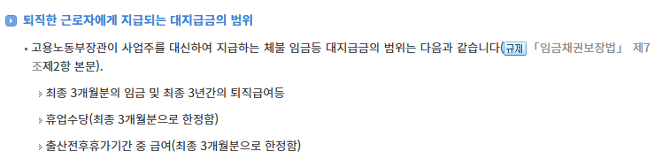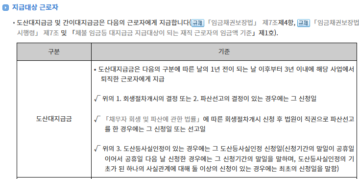또한 도산대지급금에는 ‘임금 체불’, ‘퇴직급여’, ‘휴업수당’이 각각 나뉘어져 있으므로 총액이 아닌 항목별 제한도 함께 확인해야 해요.
