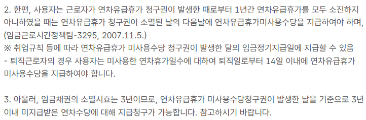 특히 연차를 쓰지 못하도록 회사에서 통제했거나, 연차사용촉진제도 하에서 사용하지 못한 연차가 있을 경우, 해당 연차에 대한 수당이 근속 중에 정산되죠.
