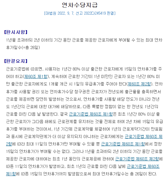 연차수당지급 [대법원 2022. 9. 7. 선고 2022다245419 판결]
