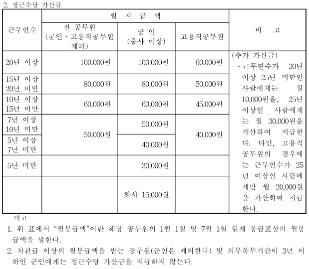 기본 정근수당은 근속기간과 상관없이 동일하지만, 가산금은 근속연수에 따라 추가로 지급됩니다. 10년 이상부터 5년 단위로 증가하죠.