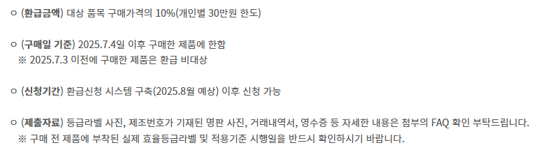 또한 환급 신청은 8월 중 시스템이 오픈된 후에 가능하므로, 현재는 구매만 해두고 영수증과 제품 정보(효율등급 라벨, 제조번호 등)를 꼼꼼히 보관해 두는 게 중요합니다.