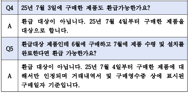 환급 대상이 되려면 반드시 2025년 7월 4일 이후에 제품을 구매한 경우에만 인정됩니다. 그 이전 날짜의 영수증이나 계약서는 환급 대상에서 제외되니 주의가 필요해요.