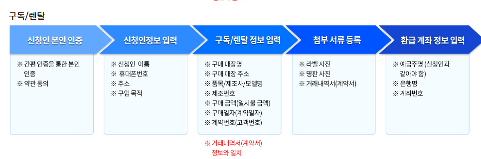 필수 서류는 구매 영수증, 거래 내역서, 제품 라벨과 명판 사진입니다.