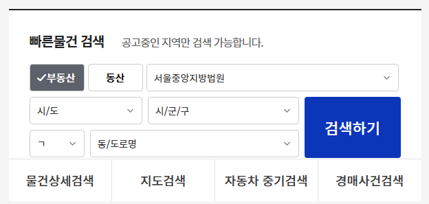 첫 화면에서 지역별, 사건번호별, 날짜별 경매 물건 검색이 가능하죠.