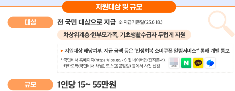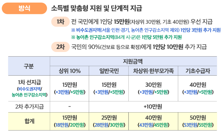 일반 국민은 1차 15만 원과 합쳐 총 25만 원을 받을 수 있습니다. 기초수급자는 최대 50만 원까지 지원됩니다.