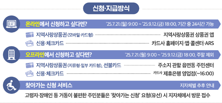 온라인으로는 카드사 홈페이지·앱, 지역상품권 앱을 통해 신청 가능합니다. 오프라인은 은행과 주민센터를 방문하면 됩니다.
