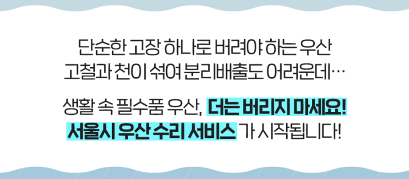 고장 난 우산을 버리지 않고 다시 사용할 수 있도록 무료로 수리해 줍니다.