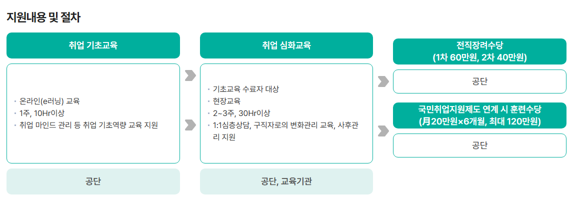 또한 국민취업지원제도와 연계하면 월 20만 원씩 최대 6개월 지원이 가능합니다.