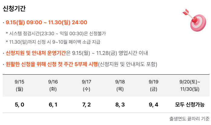 첫 주는 출생연도 끝자리에 따라 5부제가 적용되며, 이후에는 자유롭게 신청할 수 있습니다.