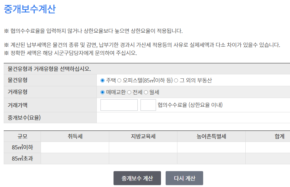 부동산 중개수수료 공식 계산기 사용하기