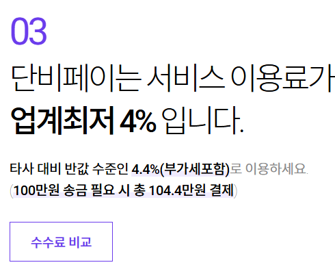 단비페이의 송금 수수료는 업계 최저 수준인 4.4%로 책정되어 있습니다.