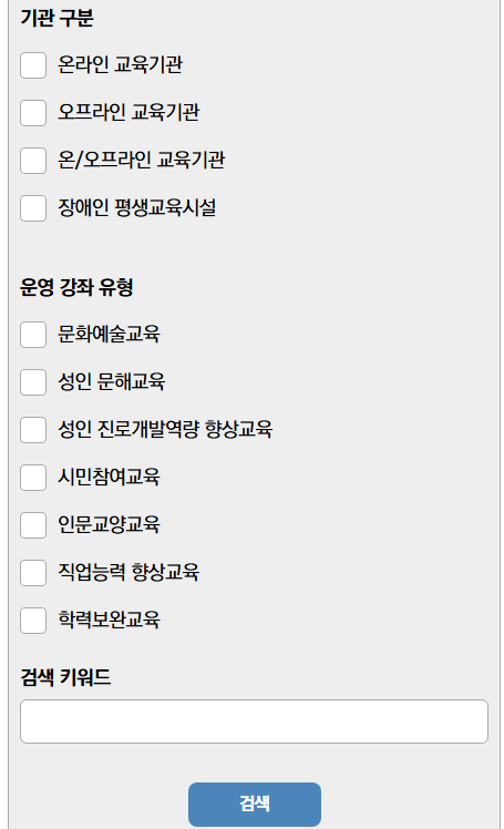 지역, 강좌 유형별로 세부 검색이 가능해 원하는 기관을 쉽게 찾을 수 있습니다.