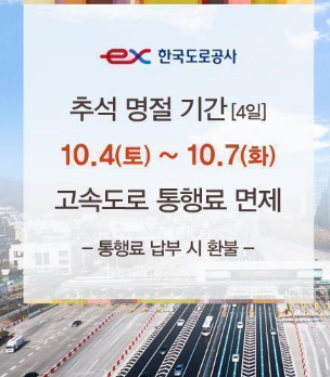 2025년 추석 연휴 톨게이트 무료기간은 10월 4일 0시부터 10월 7일 24시까지 총 나흘간 적용됩니다.