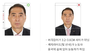 머리길이(정수리~턱)는 3.2cm~3.6cm 사이여야 하며, 전체 사진의 70~80%를 차지해야 합니다.