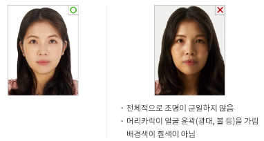 눈을 감거나 표정이 자연스럽지 않은 사진 또한 불합격 판정을 받을 수 있습니다.