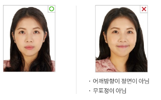 웃거나 찡그린 표정은 심사에서 반려될 수 있으며, 얼굴의 기울어짐도 허용되지 않습니다.