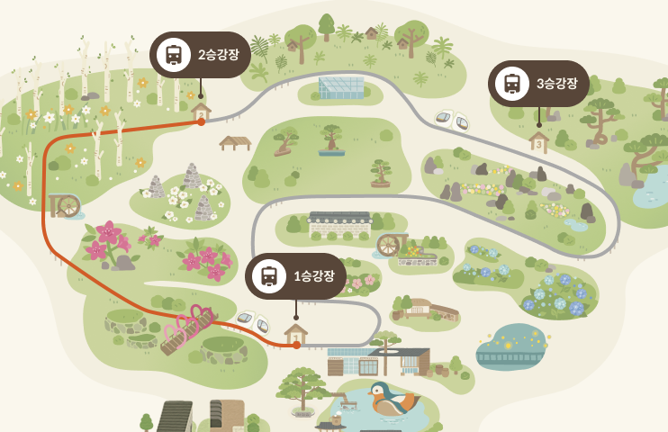 전체 관람 코스는 약 5km 규모로, 계절별 테마정원과 연못, 단풍길이 자연스럽게 연결되어 있습니다.