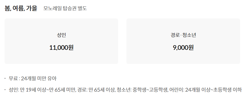 ➤ 모노레일 요금: 1~2구간 5,000~7,000원, 순환 9,000원