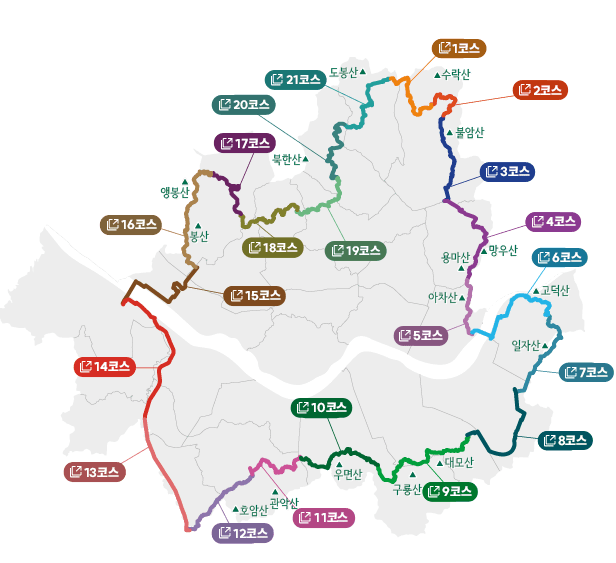 코스들은 서울 외곽을 큰 원형으로 잇는 구조라 연속·단일 구간 선택이 모두 가능합니다.