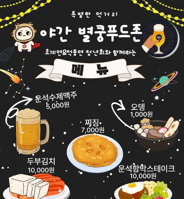 야간에 운영되는 별쿵푸드존은 지역 식재료를 활용한 메뉴 중심으로 따뜻한 먹거리를 제공해 체류 만족도를 높입니다.