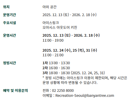 이번 시즌 운영기간은 2025년 12월 13일부터 2026년 2월 18일까지로 비교적 긴 겨울 시즌을 아우르는 일정입니다.