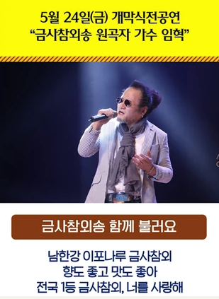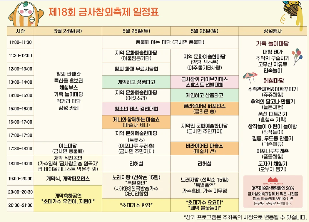 여주시 금사근린공원에서 열리는 참외축제는 다양한 참여행사와 상설행사, 그리고 초대가수 특별공연 등을 관람할 수 있습니다.