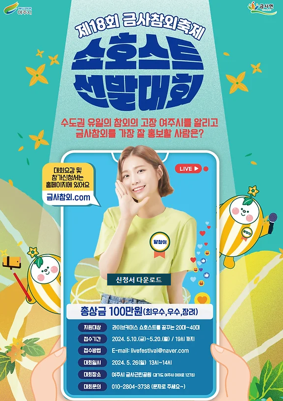 2024년 올해 여주시에서 18번째 열리는 금사 참외축제를 5월 24일(금)부터 26일(일)까지 3일간 금사근린공원에서 참여할 수 있습니다.