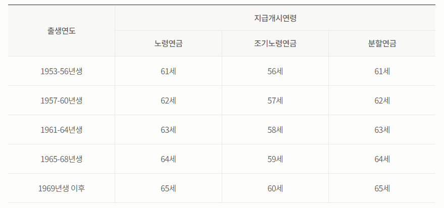 1953년부터 1968년 사이에 태어난 국민은 61세부터 64세 사이에 노령연금을 수령할 수 있으며, 1969년 이후 출생자는 65세부터 연금을 받을 수 있습니다.