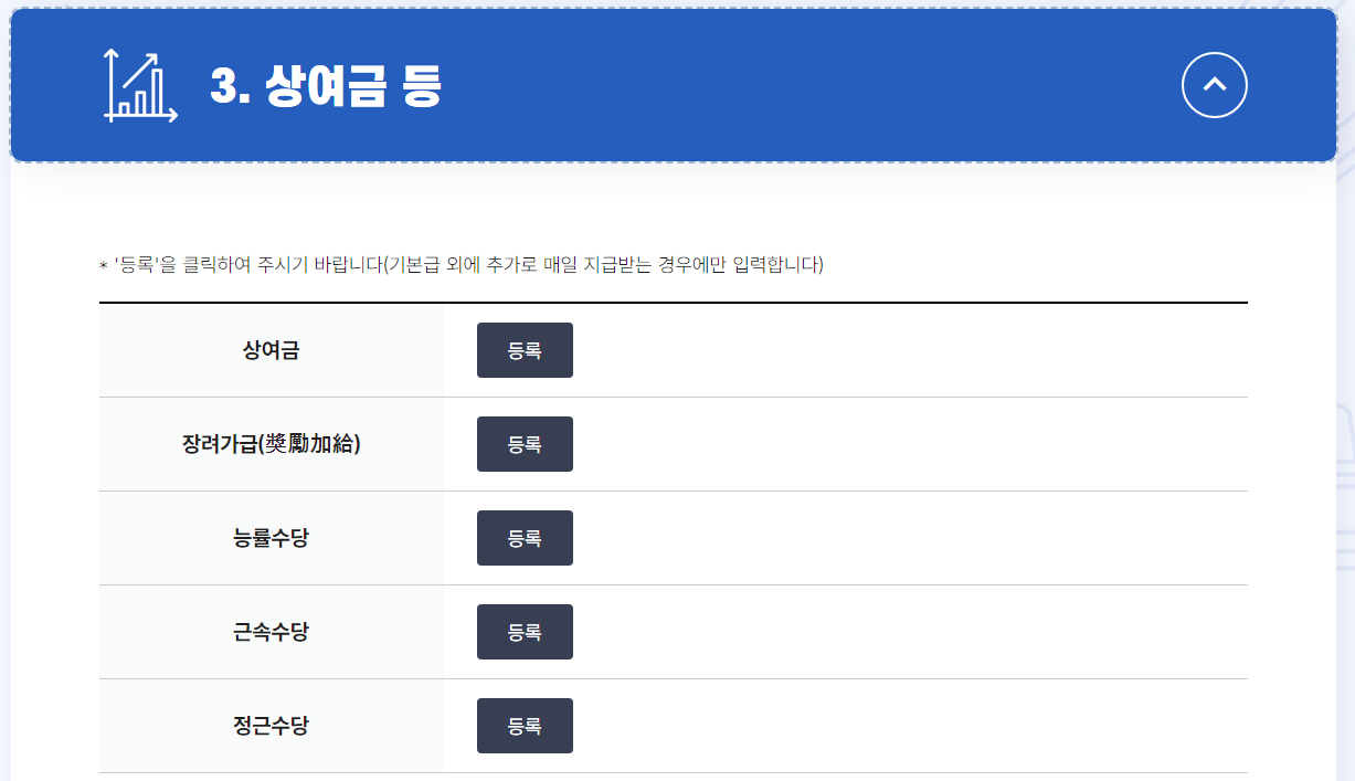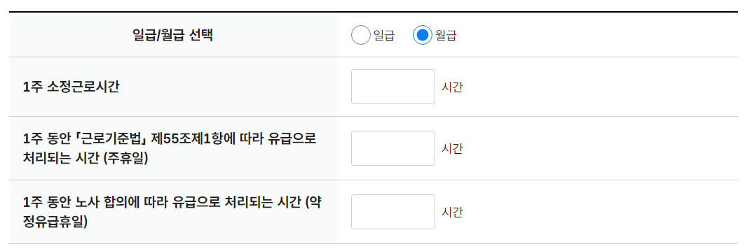 근로시간, 기본급, 상여금 등, 복리후생비, 기타수당, 수습근로자 여부를 차례대로 입력하면 자동으로 계산해볼 수 있습니다.
